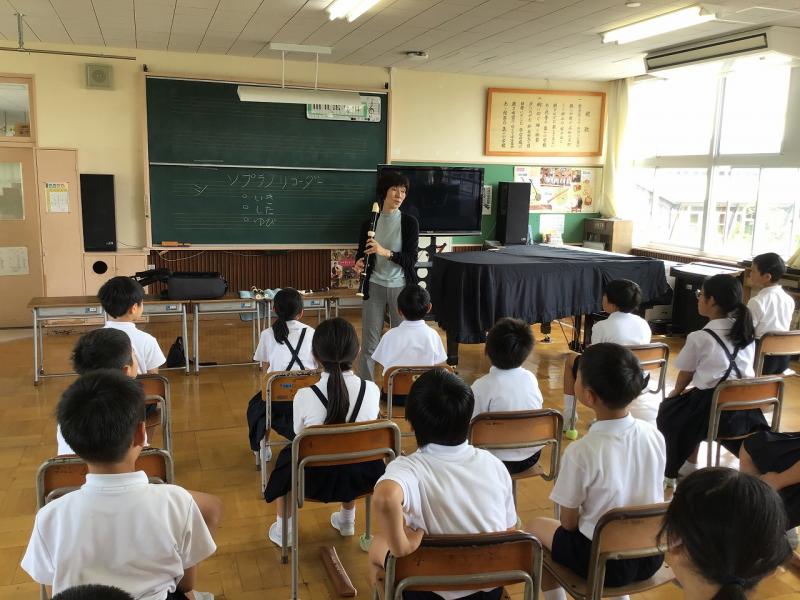 講習会では、タンギングや指の押さえ方のコツなどリコーダー演奏の基礎を丁寧に教えていただきました。講師の先生の模範演奏の音のきれいさに驚き、「なまあたたかい息で吹くとよい」というアドバイスを聞くと、児童はきれいな音を出すために、口に手を当てながら、どのような息の出し方がよいか夢中で探っていました。