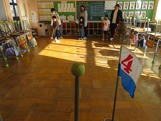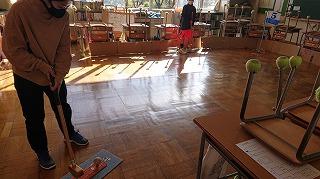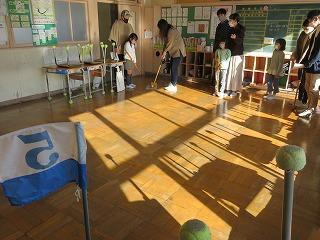 今日は,全校で親子行事を実施しました。校舎内でグラウンドゴルフを行いました。低中高別に時間を区切って実施しました。