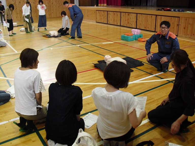 5.6年生の保護者の皆さんは、夏休み中のプール当番のための救命救急講習に参加して頂きました。お母さんの参加で、とても熱心に実習をしていただきました。
