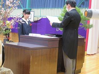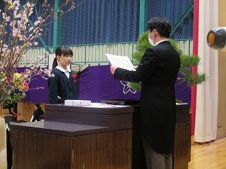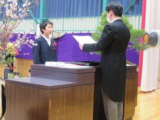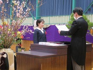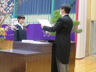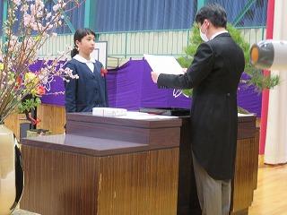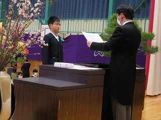 各学年の学級担任から学級名と児童数の報告があり、その後、児童代表の勝二さんに修了証書を手渡しました。