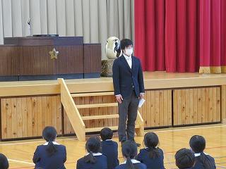 本校には4年生の担任として勤務して頂きました。藤江先生同様、お若くてエネルギッシュです。休み時間には、子どもたちと鬼ごっこをして走り回っているかと思う、すぐに授業の準備に取りかかるなど、メリハリのある仕事ぶりでした。子どもたちとは、遊ぶときも学習するときも常に一生懸命でした。先生は、4月から相見小学校で勤務されます。