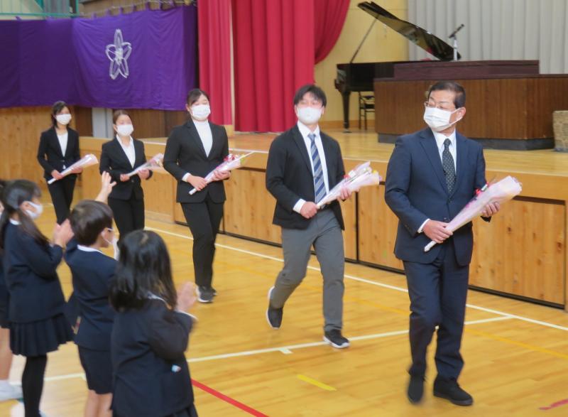 本校には教頭先生として5年、社会科や書写などを教えていただく先生として2年、合計で7年間、本校の教育活動にご尽力を賜りました。先生は、柔道家としての厳しい面と子どもたちや若手職員の成長を願う一途な面がありました。若手職員から絶大な信頼をうけ、タイムリーな指導を児童にも、職員にもしていただきました。先生は、4月から樋川小学校で勤務されます。