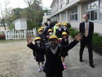 グラウンドの隅の小高いお山まで避難します。自分の命を守る訓練なので,どの子も真剣でした。移動も素早かったです。今日は,上出来です。