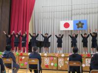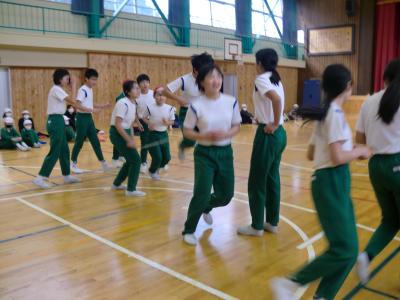 音楽に合わせていろいろな縄跳びの技を披露しました。ステージの上で縄跳び大会の再現をし