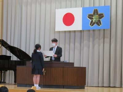 入選した児童の名前がひとりひとり呼ばれました。6年生井本さんが代表して表彰状をもらい、