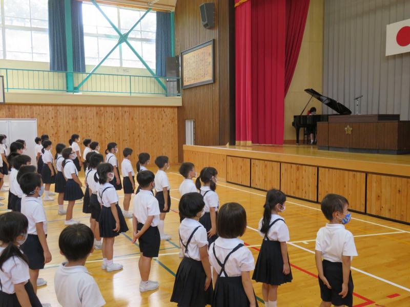 早朝から全校児童が体育館に集まり始業式を行いました。
