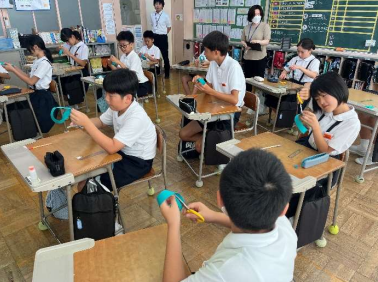 6年生は、昨年度の算数教室で取り上げた「紙テープを輪にして切るとどうなるか」の発展で、紙テープを何回かねじ
