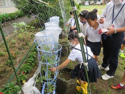 鉢に植えたトマトの観察をしました。