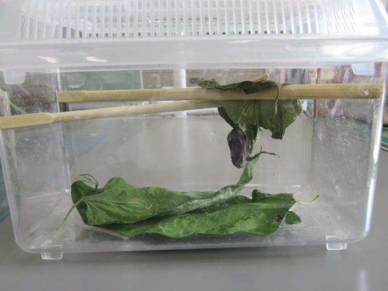 今朝,蛹の色に変化が見られました。黒っぽい色に変わり,いよいよ羽化かなと思いました。