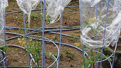 トマトが鉢に栽培してありますが、黄色い花が咲いています