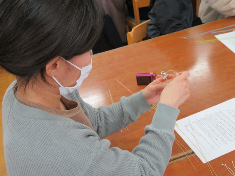 午後1時、地元の講師、林谷恵美子さんの指導のもと、6年生12名がお母さんとペアで卒業式につけるコサージュを作りました。