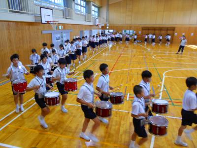 10月18日(土)の運動会に向けて、高学年はマーチングの練習をがんばっています。今年度は、押水小学校の校歌を初めて鼓笛で披露します。春から練習してきたので演奏はとても上手になってきました。リズムに乗って息を合わせて歩けるように、一生懸命、練習しています。