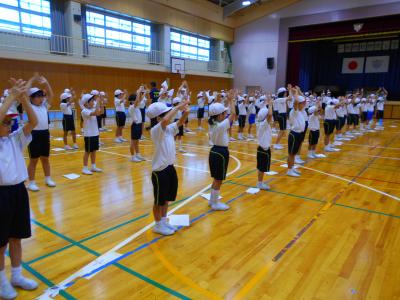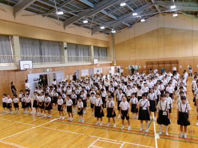 4月6日の開校式から100日あまり。新たな環境で多くの友だちと一生懸命がんばってきた1学期を振り返り、元気いっぱいの校歌を体育館に響かせました。
