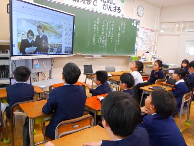 1月15日、4年生が七尾市立朝日小学校、中能登町立鹿島小学校の児童とオンラインでそれぞれの地域の魅力などを交流をしました。押水小の4年生はグループごとに調べた宝達志水町の伝統や産業などについてクイズを交えて伝え、楽しく交流できました。