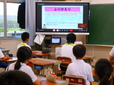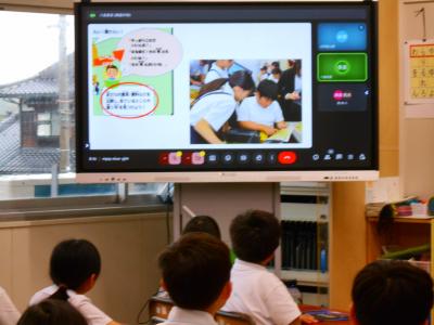 各教室のモニターには、<わからないところがあっても「わかりました」って言っていないかな?「どういうこと?」「どうして?」と尋ねることで、学びが深まっていくよ。1学期に、こんな素敵な学び合いの姿があったよ>などのプレゼンが映し出され、子ども達が真剣な表情で見入っていました。
