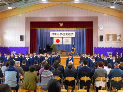 開校式では、6年生の児童代表が「三校のよさを生かして、あいさつ、協力、笑顔を大切に、自分たちで新しい学校を作り上げていきたい」と誓いの言葉を力強く述べました。その後、押水小学校校歌を5・6年生で元気いっぱいに歌い上げました。