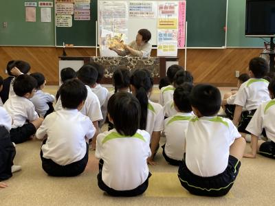 6月4日(水)地域の読み聞かせボランティアである「おひさまクラブ」の皆さんにょるお話会が行われました。特別活動室に集まった1年生は、静かに聞き入ったり、笑ったり、驚きの声を上げたりと、お話の世界に浸ってとても楽しそうでした。最後に願い事を唱えながらろうそくを吹き消し、素敵な時間を過ごしました。