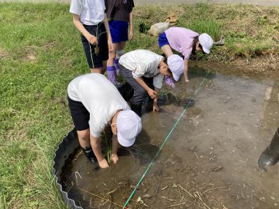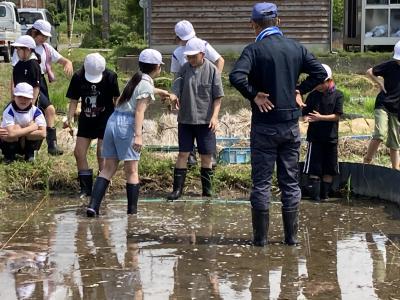 6月4日(水)に5年生が田植えを体験しました。1・2年生のサツマイモ植えでもお世話になった山田礼二さんが、田んぼの先生になって教えてくださいました。