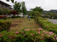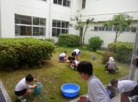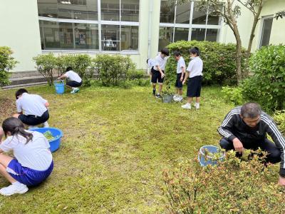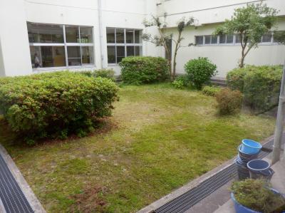 中庭の草がたくさん生えてきたので、昼休みに少しずつ教頭先生が草むしりをしています。