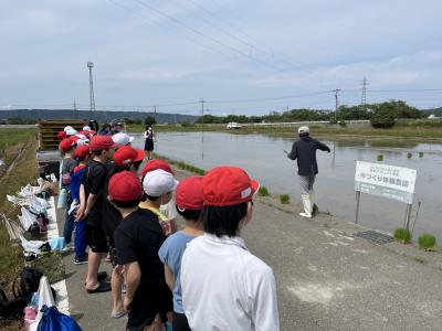 5月23日、アグリスターオナガの濱田さんに準備していただき、5年生が田植え体験をしました。