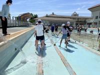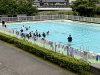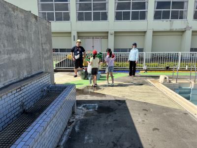 プールの周り、ぐるっと排水溝があります。3・4年生、お願いします!
