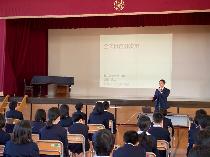10月31日(火)5時間目に、5・6年生は体育館で講演会に参加しました。この日は瑞穂小学校の5・6年生も一緒に参加しました。ツエーゲン金沢クラブアンバサダーの辻尾真二さんを講師として、「プロサッカー選手は1時間半から2時間の試合のために、22時間準備をする」「チャンスの数は平等。準備ができているかどうかが大切」「正解を選択するのではなく、選択したことを正解にする」など、いろいろな言葉を通して分かりやすくお話くださいました。