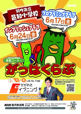 NHK金沢で放送中の「かがのと イブニング」の金曜コーナー「がっぱくらぶ」の取材を受け,本校の「プログラミングクラブ」と「イングリッシュクラブ」が紹介されることになりました。どちらのクラブも,本校の特色を生かし,子ども達が楽しく活動している様子が見られました。詳しくは,添付のチラシにてご確認ください。たくさんの皆さんに見ていただきたいと思います。