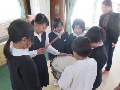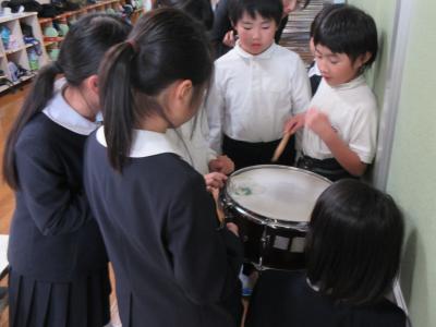 小太鼓を鳴らして、手で震えを確かめていますね。