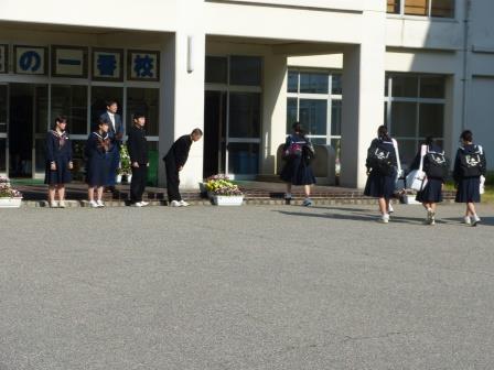 生徒会、学級会の各役員によるあいさつ運動です。一人一人の名前を呼んでの大きな声のあいさつが交わされます。朝の元気なあいさつが、楽しい学校生活の始まりを感じさせます