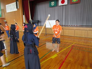 剣道部でも、まずは部員による迫力ある打ち込みの練習を見てもらい、その後、竹刀を手にして「面」「胴」「小手」の技を体験してもらいました。留学生は「物(この場合は竹刀)」で人を叩くことなど、経験がないことなので、遠慮気味にそーっと打っていましたがとても楽しそうでした。