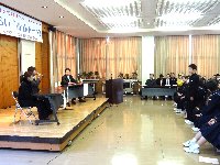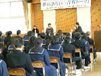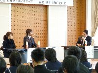 羽咋ライオンズクラブの協力のもと、コーディネータとして中山貴之氏(盤水社)、パネラーとして本校OBの盛田陽介氏(PFU)と長井幸子氏(長井瓦店)においでいただき、学生時代や仕事に関するお話をしていただきました。身近な先輩方から将来の進路に参考になるお話がたくさん聞くことができました。