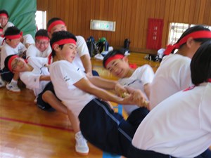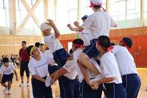 全校が赤・青・黄団に分かれ、各委員会が企画した玉入れやぞうきんリレーなどの種目を競い合いました。どの団も、団長を中心に一つにまとまり、競技に応援に、熱戦を繰り広げました。最後は全校で円陣を組み、声を掛け合い大いに盛り上がりました。3年生にとって思い出に残る体育祭となりました。