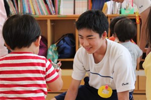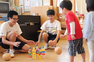 3年生が家庭科の授業の一環として、邑知保育所を訪問しました。保育園児たちは中学生のお兄ちゃんやお姉ちゃんの訪問に大喜びで、家庭科の授業で作成したおもちゃを使って一緒に遊びながら楽しい一時を過ごしました。