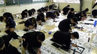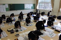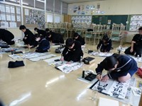その後の書き初め競書会では1年は「不言実行」2年は「新たな目標」3年は「無限の可能性」という文字を毛筆でしたため、各階の廊下に掲示しました。また書き初めのあと、1、2年生は今年の漢字一文字を各自が考え、毛筆で書きながら気持ちも新たに3学期第一日目を過ごしました。