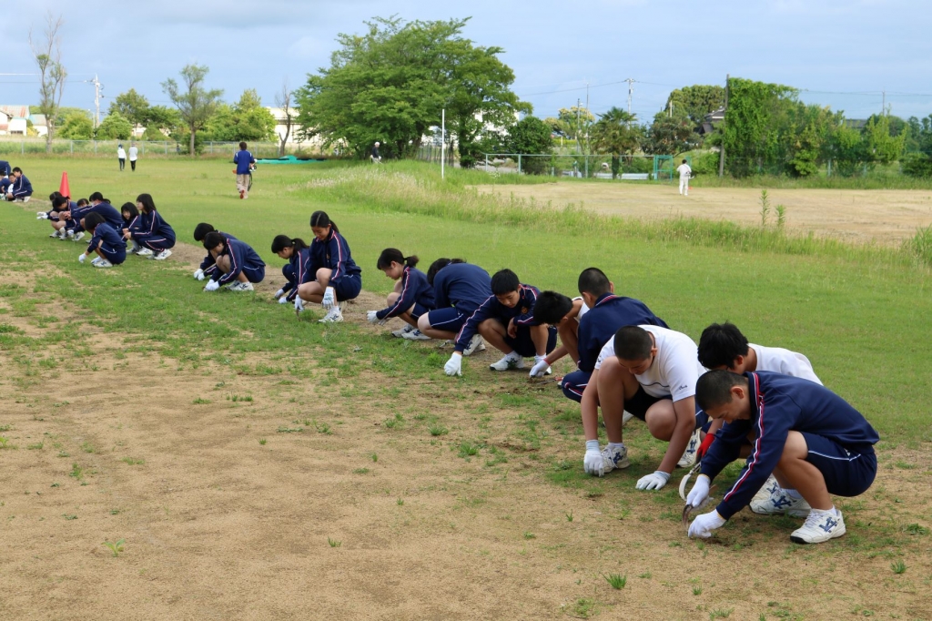 広い校地の至るところから草刈機の音が鳴り響き、手際よく刈られた草が集められました。見渡す限り草が茂っていた校地内でしたが、作業後はすっきりと整備され環境のよい中で活動ができるように整えられました。