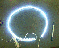 ③ 照明として、LEDが帯状になったものをプラスティック容器の外に巻いてセロテープでとめる。高さは下から2cmくらい。 |