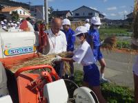 9月22日(金)の3・4限目、5年生は下区の三浦区長さん、谷喜義さんをはじめとするたくさんの地域の方にご指導いただき、稲刈りを体験しました。これまでに稲刈りを体験したことのある児童は3名ほどしかおらず、大変貴重な体験となりました。