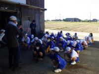 10月31日(火)、5年生は米作り体験を締めくくるもみすりを見学しました。機械の中を通って、米袋にもみ殻がとれた粒が出てくると、子どもたちは「おー!」と声をあげていました。長年にわたって5年生の米作り体験を支えてくださった谷さんは、今年度限りでお辞めになられます。これまでお世話してもった鹿西っ子の思いも込めて、大きな声で感謝の気持ちを伝え、見学を終えました。
