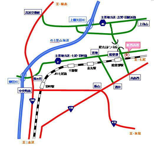 のと里山海道「柳田IC」 下りる→「柳田IC」交差点を 右折→「猫目」交差点を 直進(七尾・鹿西方向)