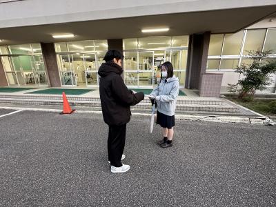 下校する生徒や地域の方々に向けて、学校前や能登部駅前で実施しました。