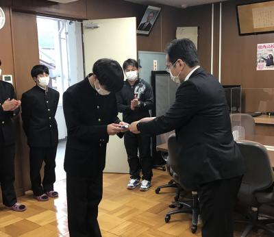 校長室で授賞式を行いました。校長先生から「受験勉強中の3年生にとって、一服の清涼剤のような企画になりよかった」とのお言葉を頂きました。学校生活を『明るく、楽しく、元気よく』学習も部活動も頑張ります!