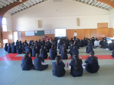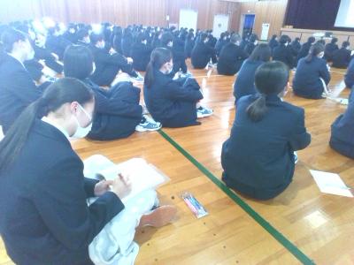 進路実現のための学習時間や進路先についての考え方、大学受験に際しての活動報告書から読み取る「求められている力」について触れて、「自分で問題点を発見」し「課題解決に向けて実践」するよう主体的に自分を育成する姿勢の重要性について改めて確認をしました。3月には、どのように過ごすかを自分で判断しなければならない時間が多くなるため、周囲と差をつけるチャンス。「今だからこそできること」についての話でした。