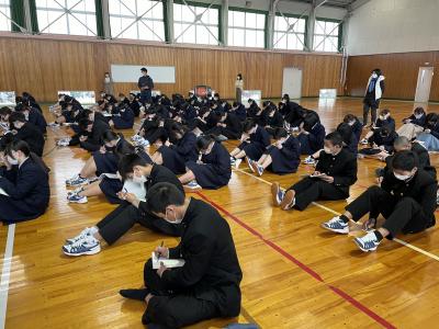 地震発生の放送後には身の安全を守る行動をとり、その後避難の案内に従って全校生徒がグラウンドに無事集合しました。消防の方からは行動が迅速であったと良い講評を頂きました。