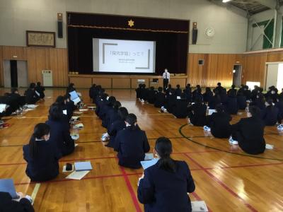 「探究とはなんだろう?」「探究と調べ学習の違いとは?」「SDGsについて理解しよう」といった内容についてお話がありました。これからの社会では自ら課題を発見し、その課題を解決する力が求められます。探究学習を通して「思考力・判断力・表現力」といった力を伸ばしていきたいですね。1年生1学期はまず能登の魅力を再発見し、発信するというところからスタートします。