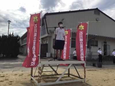 第26回北信越高等学校新人陸上競技大会が10月22日(金)~24日(日)に石川県西部緑地公園陸上競技場で開催され、本校から23H本田大騎さんが、石川県代表として男子走高跳に出場します。10月21日(木)昼休みに標記贈呈式が校長室で行われ、本人は「日頃の練習通りを心掛け、力むことなく、ベストを尽くす」と抱負を学校長に語りました。職員・生徒一同より、健闘を祈ります。