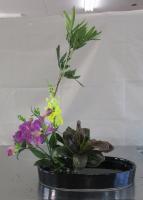 さらしほうき草(白い枝)ケイトウ(赤い花)アストランチア(最後方の小さい花)は基本形。トルコ桔梗(白または黄)とナルコ(白い縁の葉)、花器はそれぞれの感性で。3人ずつ作品を交代で載せます。今回で2回目です。