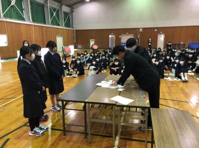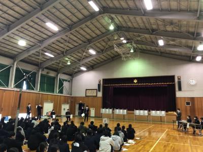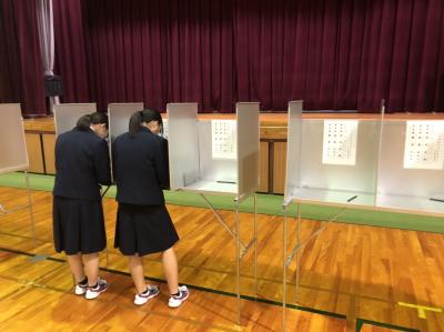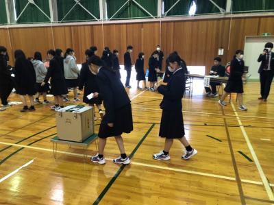 石川県並びに中能登町選挙管理委員会の方々による「選挙出前講座」が開催されました。生徒たちは、選挙に関する説明を一通り受けた後、受付から投票・開票までの流れを体験しました。本番さながらの雰囲気に、「初めてなので少し緊張しました。」「大人の世界を知りました。」「思っていたよりも簡単で、どんな世代でも気軽に投票に行けると思いました。」等の感想がでました。今回の「主権者教育」を通して、政治への関心や理解を深め、民主主義について少しでも考える機会になってくれればと思います。