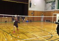 ノックの様子です。左右のネットぎわにシャトルが来たときの練習です。コートの真ん中からのフットワークやラケットの使い方の練習です。初心者が多く、経験者に教えてもらいながら練習しています。すぐにはうまくできませんが、繰り返し練習して上達を目指します!
