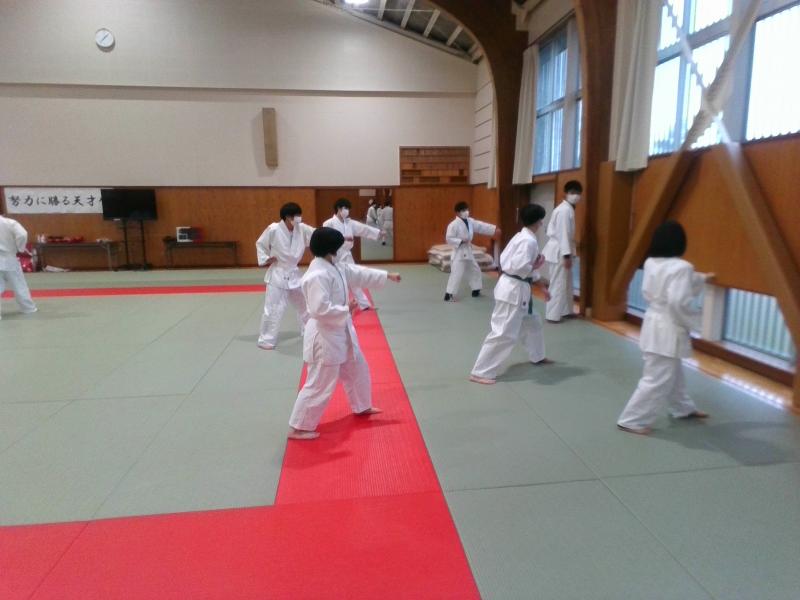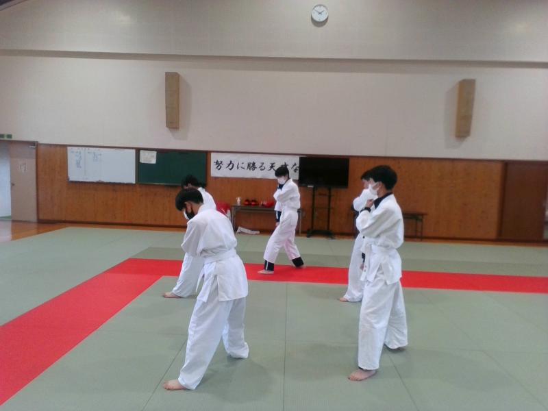 1,2年生体育の柔道選択者は、感染症対策として、生徒同士が近距離での活動を避けるために、先週から空手を行っております。基本稽古や移動稽古を行い、「形」の練習に取り組んでいます。初めて空手をする生徒がほとんどですが、生徒たちは試行錯誤しながら楽しく取り組んでいます。