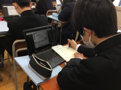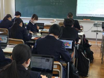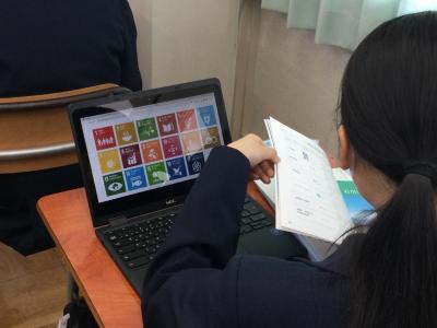 今回の総合的な探究の時間は、SDGs 17の目標の中から気になるものを一つ選び、その目標に関連する課題を設定するというものでした。一人一台端末を駆使して、「SDGsとは何か」ということを自分の言葉で説明できるように調べ、理解したうえで、自分が気になる課題を考えました。SDGsの目標は地球規模で達成すべきものですが、自分の身近なことと関連付け、「今自分ができることは何か」ということについて、周りの友人たちと話し合いながら考えを深めていました。